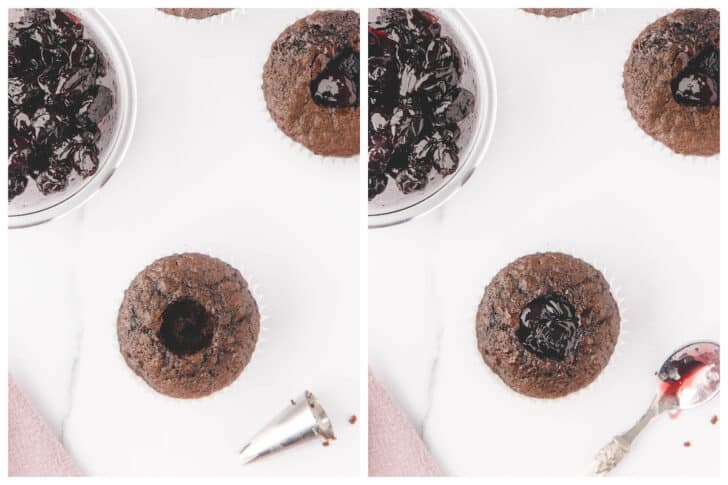 Then, use a small spoon to fill each cupcake with some of the cherries. If you end up with any extra cherries after making this Black Forest cupcake recipe, treat yourself to an bourbon apple cider cocktail garnished with a few of the cherries.
