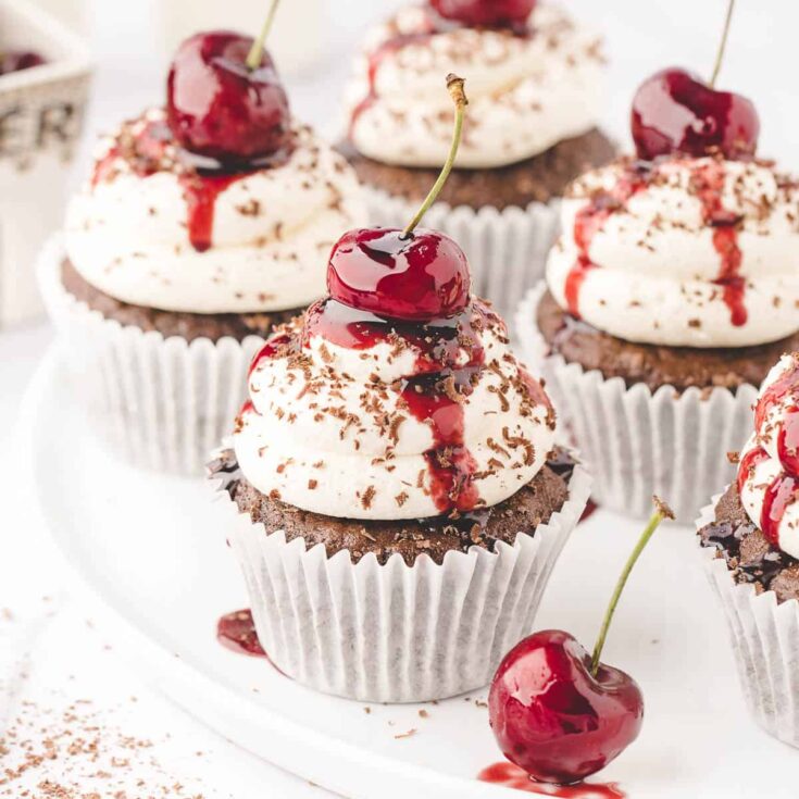 Heads up that most boxed mixes make 24 cupcakes, while the recipe below yields 12 Black Forest cupcakes.