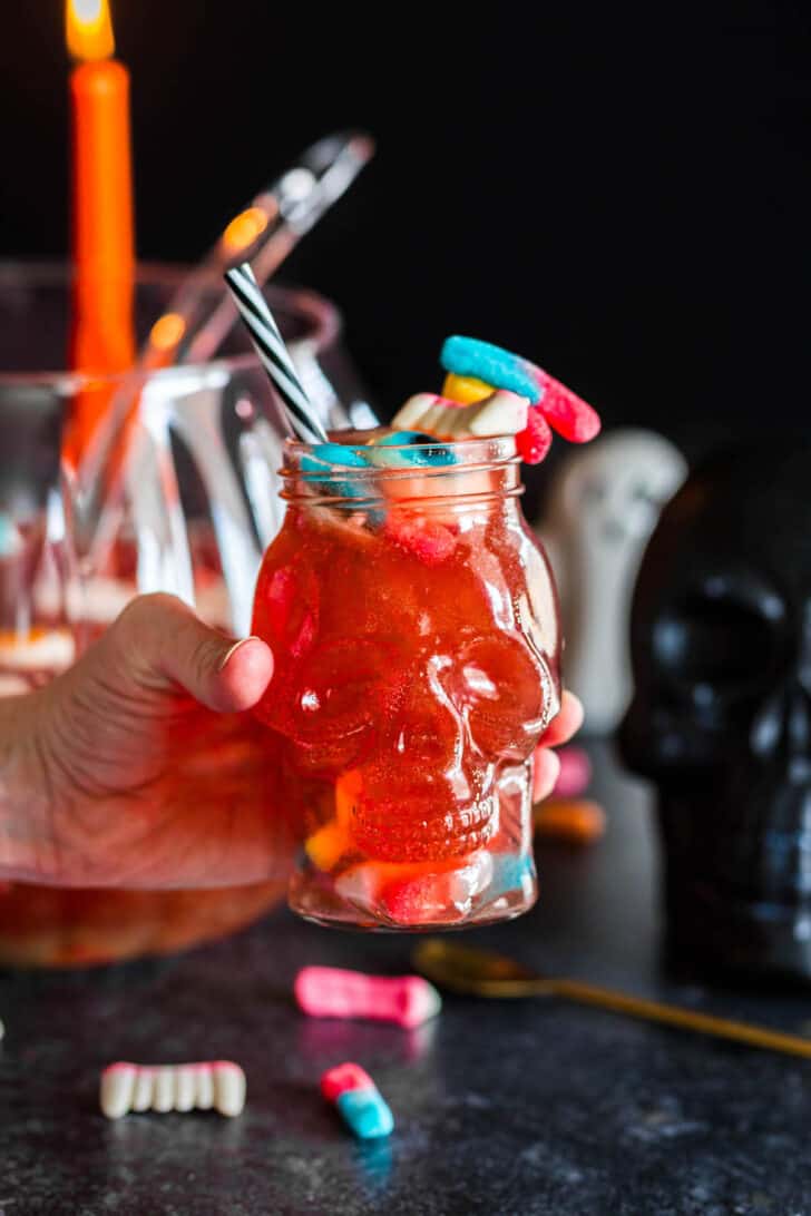 For a younger kid’s party, keep the Halloween punch non alcoholic of course, and consider using plastic or paper spooky cups, and colorful straws, for serving. Halloween punch for kids that are a bit older would be great served in skull tumblers [affiliate link].