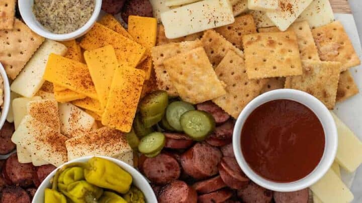 One of our favorite versions of cheese and charcuterie board is this southern inspired board filled three types of sausage, pickled vegetables, BBQ sauce, pimento cheese and more!