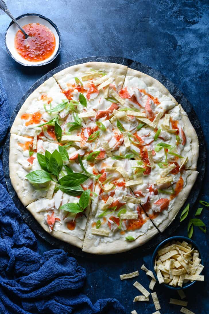 Garnish this best crab rangoon pizza recipe with sliced green onions, basil (Thai basil is best if you can find it) and crispy wonton strips (those are a “salad topper” usually found at the grocery store near the bag salads).