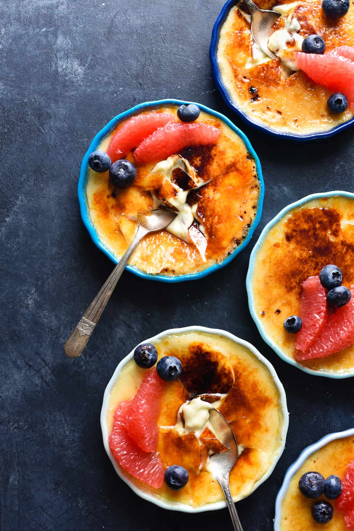 - fresh fruit to garnish – this is optional, but I love including some grapefruit segments and a few fresh berries on top when serving creme brulee. Any extra blueberries can be used to make buttermilk blueberry muffins.